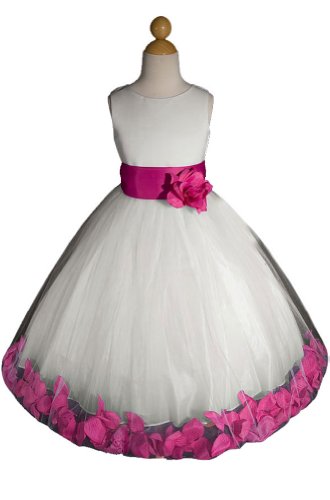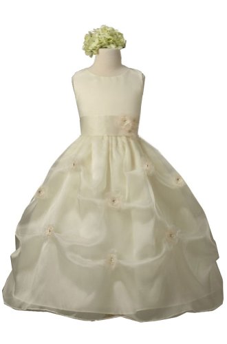 This Princess Dress is perfect for a Wedding as a Flower Girl Dress, Pageant Holiday Dress, Easter Dress, Summer Dress, Recital, Formal Event, a Special Dress for her birthday Party or Heavenly keepsake pictures. This elegant bodice is made out of high quality ivory satin. There has a removable flower on the waistline to make this dress more beautiful. The skirt has 3 layers. The inside layer is satin, attached with a netting for additional fullness, the middle layer is soft satin; and the outside layer is made out of organza with flowers attached. The back of the dress has a hidden zipper and a tie sash for a perfect fit at the waist. Absolutely gorgeous!